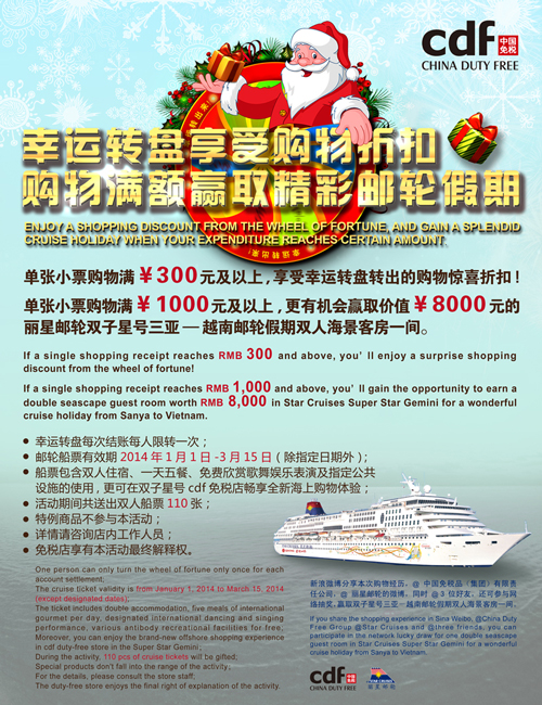 圣誕元旦臨近,旅游價(jià)格相對(duì)平穩(wěn)、上班族集中休假等因素使得今年雙節(jié)旅游市場(chǎng)再次迎來出游小高峰。其中不少公司白領(lǐng)將春節(jié)出境游計(jì)劃提前,選擇性價(jià)比更高的錯(cuò)峰出游。各大商家的年終促銷活動(dòng)讓節(jié)日提前升溫,2013年12月15日-2014年1月5日期間,中國免稅品(集團(tuán))有限責(zé)任公司(以下簡(jiǎn)稱中免集團(tuán))旗下十家免稅店聯(lián)合推出“幸運(yùn)轉(zhuǎn)出來&幸運(yùn)秀出來”年終主題促銷活動(dòng),貼心的購物折扣以及價(jià)值約百萬元的麗星郵輪船票大獎(jiǎng),為雙節(jié)出境游客送上別樣驚喜。