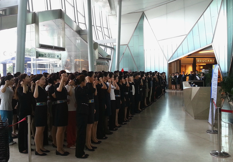 “我宣誓,我們將以客戶為中心,以市場(chǎng)為導(dǎo)向,不怕困難、專業(yè)高效、團(tuán)隊(duì)合作、勇于創(chuàng)新,用誠(chéng)信經(jīng)營(yíng)贏得顧客的信任,用優(yōu)質(zhì)服務(wù)換取顧客的滿意。”洪亮的聲音在三亞市內(nèi)免稅店內(nèi)回響,宣誓著承諾和責(zé)任。