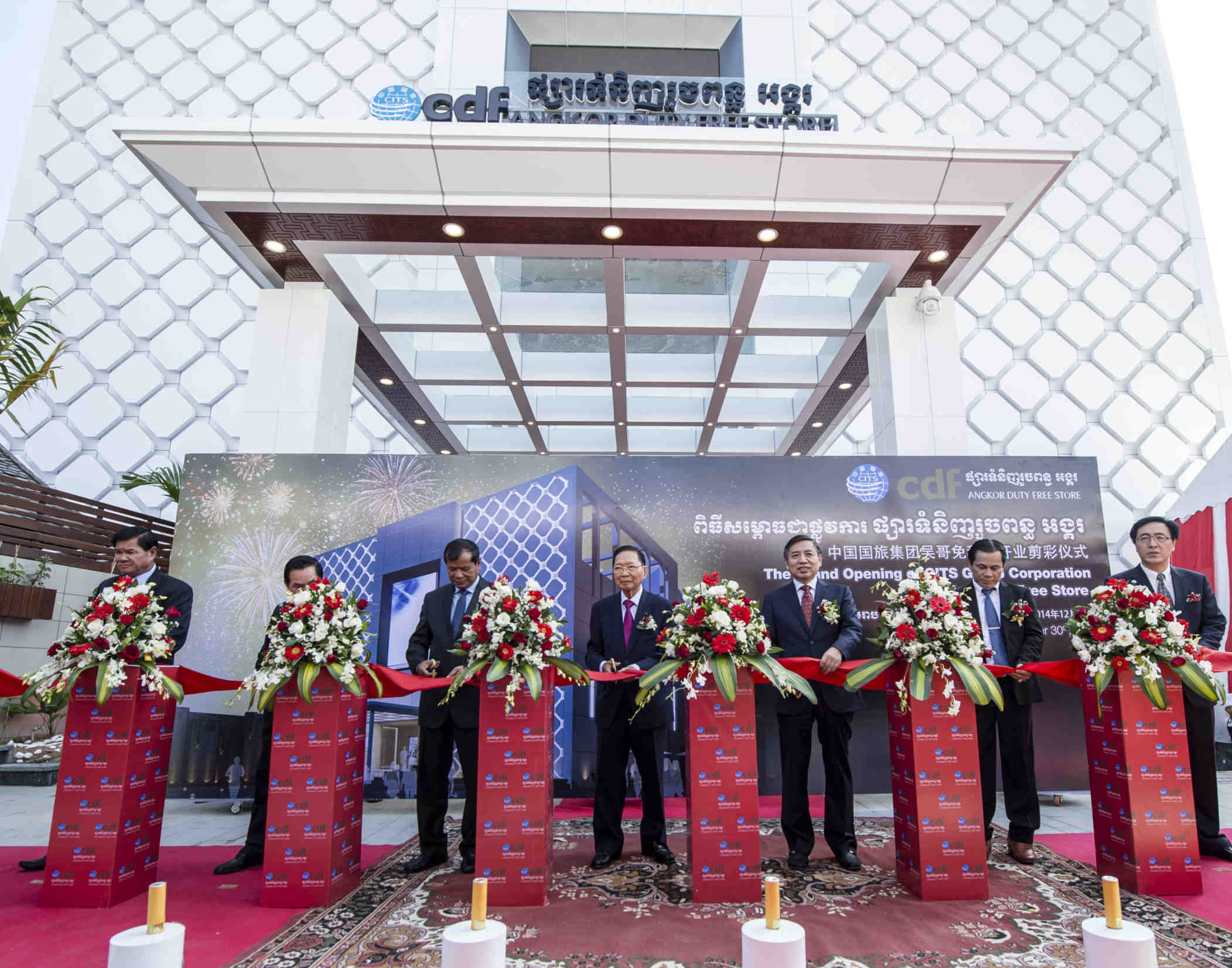 2014年12月30日,備受矚目的中國國旅集團(tuán)吳哥免稅店在柬埔寨王國暹粒市隆重開業(yè)。柬埔寨王國副首相吉春閣下、旅游部部長唐坤閣下、暹粒省市各級主要官員,國旅集團(tuán)董事長、總經(jīng)理王為民,國旅股份公司副總裁彭輝,總會計師閆建平,副總裁于寧寧,總裁助理陳志新,以及國際供應(yīng)商代表、合作伙伴代表等近200人參加了開業(yè)慶典活動。